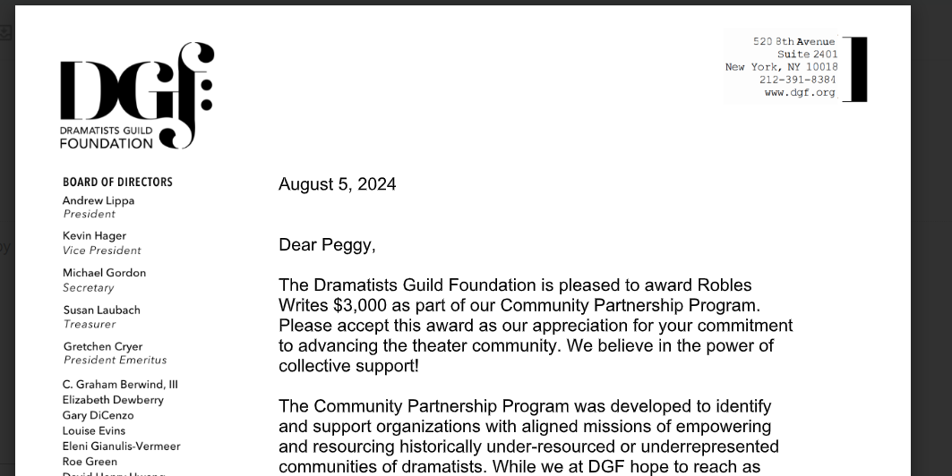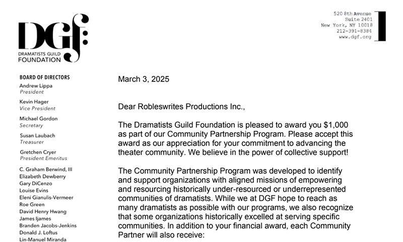 Robleswrites Productions, Inc. is a 2025 Community Partner with The Dramatist Guild Foundation!