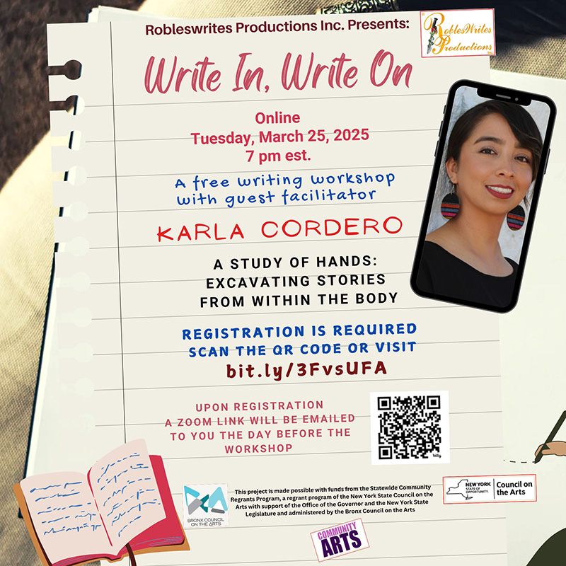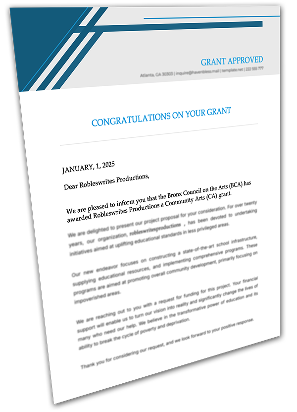 We are pleased to inform you that the Bronx Council on the Arts (BCA) has awarded Robleswrites Productions a Community Arts (CA) grant